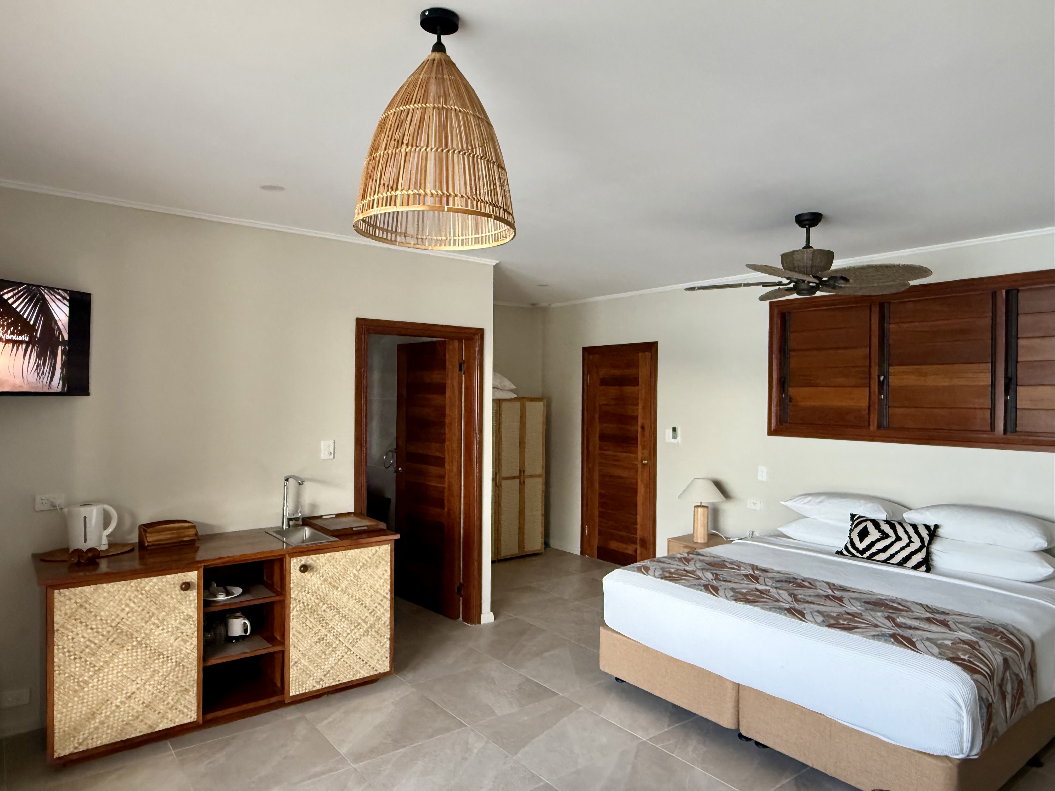 这间豪华别墅坐落在一个僻静的岛屿地区,提供一个spa浴缸、私人露台和自行车。客房采用美拉尼西亚风格的装饰,并配有风扇、一台冰箱和带免费洗浴用品的连接浴室。 请注意,价格是基于2名成人和1名未满15岁的儿童的价格。